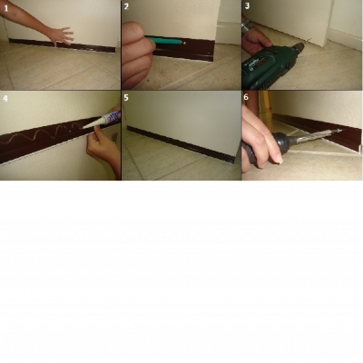 O friso contém 3 indicadores para fixação com parafusos, marque utilizando um lápis e fure a porta com broca de 1/8. Na parte interna do friso use cola de silicone em toda a sua extensão,