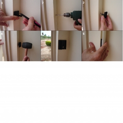 - Com a ajuda de um martelo de borracha, fixe o pino na parede com o lado vazado encostado na quina e o furo do click fique voltado para a porta .